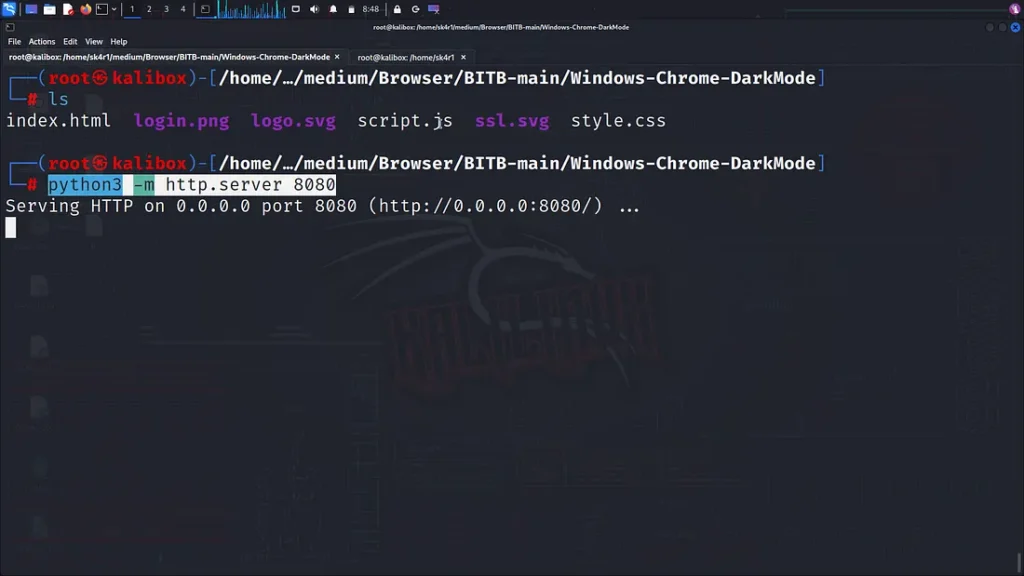 PARTIE 7 : Lancez un serveur HTTP simple dans le dossier contenant notre fausse fenêtre contextuelle, fonctionnant sur un port autre que celui de setoolkit (par exemple, le port 8080).
