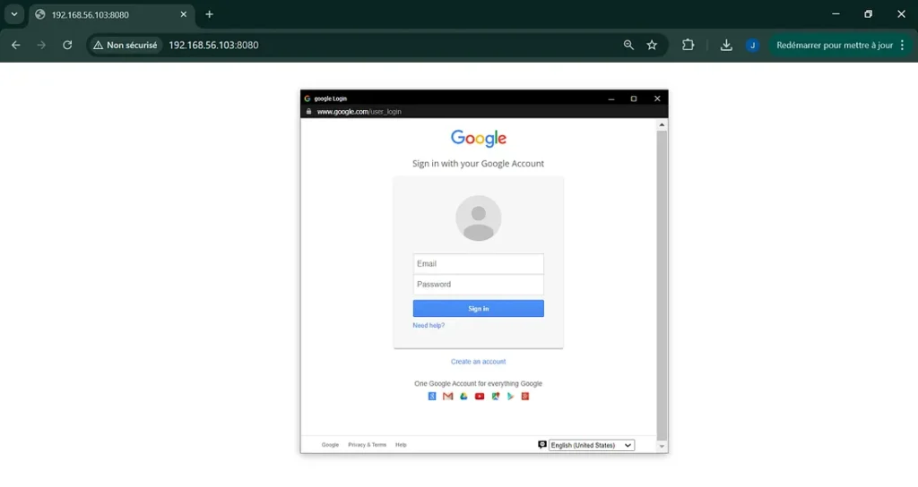 Simulation d’une fenêtre d’authentification : Un pirate informatique astucieux conçoit une fausse fenêtre d’authentification qui ressemble trait pour trait à une véritable fenêtre contextuelle, comme celles qui s’affichent lors de la connexion à un service tel que Google ou Facebook. Il utilise HTML, CSS et JavaScript pour créer cette illusion parfaite.