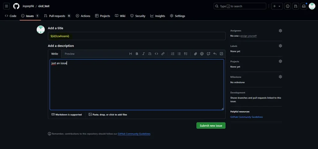 Un attaquant pourrait créer une issue avec le titre suivant : " ; whoami ; #